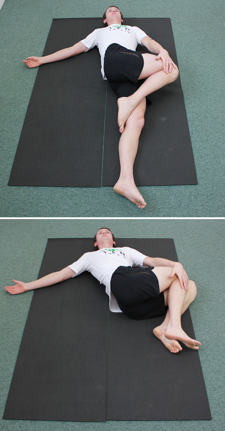 In similar fashion to the stretch above, this requires a set on each side. This stretch focuses on the rotational element of your spine, coming mainly from the part that rotates the most: the thoracic (middle) spine. Lie on your back, with your legs tucked together and your arms out to the side, at shoulder height. Bend your knees, so that your feet are flat on the floor and knees remaining together. Tip your knees to the right side while keeping your left shoulder blade in contact with the floor, and slowly allowing the knees to fall towards the floor.