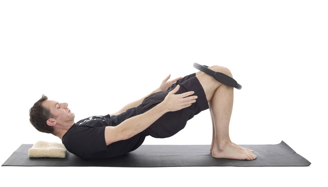 1. Lie on your back with a small folded towel under your head, heels towards your buttocks and the ring placed on top of your knees. Exhale, push your knees out against the ring and draw your hip bones towards your rib cage.